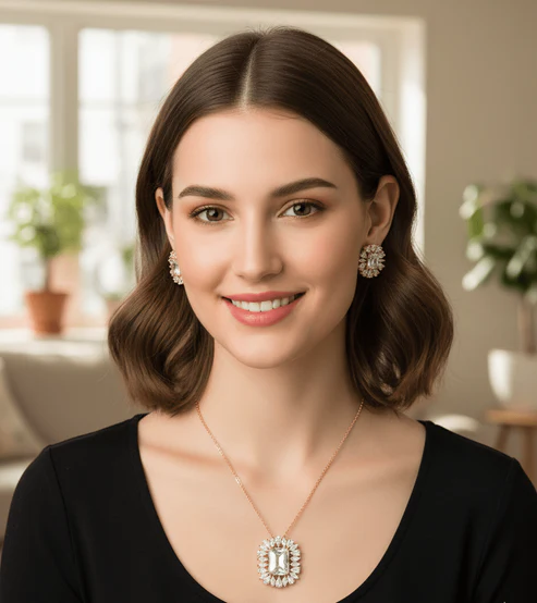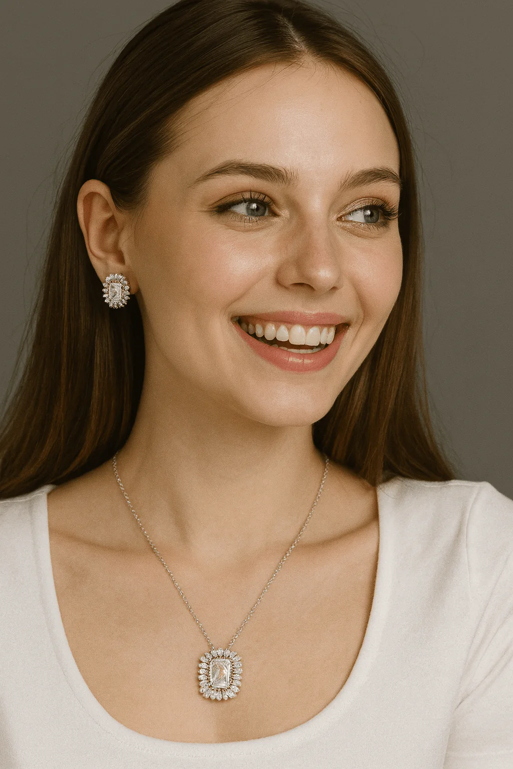 أضفِ لمسة من الفخامة الملكية إلى إطلالتك مع طقم هالة الزمرد المتألقة من مجوهرات فور يو، المصمم ليجمع بين الأناقة الخالدة والبريق الراقي. تتوسط الطقم كريستالة مركزية مستطيلة كبيرة محاطة بهالة من الأحجار الكريمة المصقولة بدقة، مما يمنحه حضورًا فاخرًا يبرز أناقة إطلالتك في كل مناسبة. يأتي الطقم بقلادة وأقراط متطابقة، متوفر باللونين الذهبي الكلاسيكي والفضي العصري، ليكمل أي ستايل رسمي أو سهرة أنيقة.